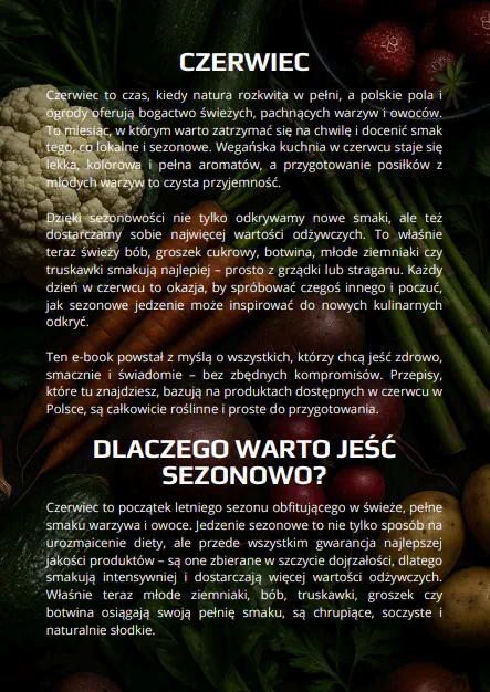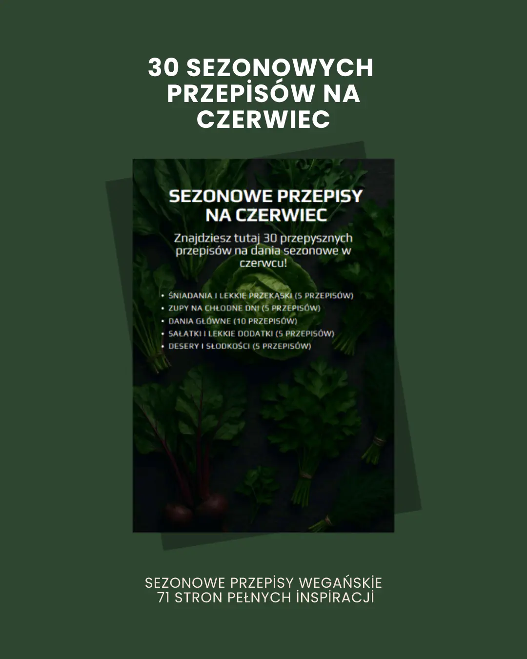 E-book „Sezonowe przepisy na czerwiec” to około 70 stron inspiracji, które pomogą Ci gotować w zgodzie z sezonem i wejść w letni tryb bez chaosu w kuchni. Znajdziesz tu 30 w pełni roślinnych przepisów. Od śniadań po desery, wszystko w duchu prostoty, świeżości i letniej sezonowości. Jeśli chcesz jeść sezonowo, lekko i roślinnie, a jednocześnie konkretnie i bez udziwnień, ten e-book będzie Twoim kuchennym wsparciem na cały czerwiec.