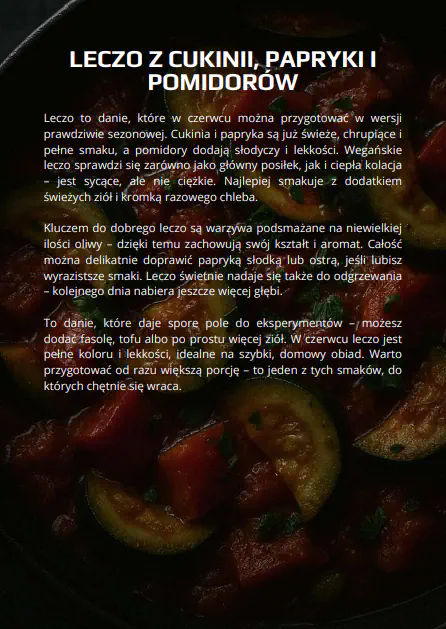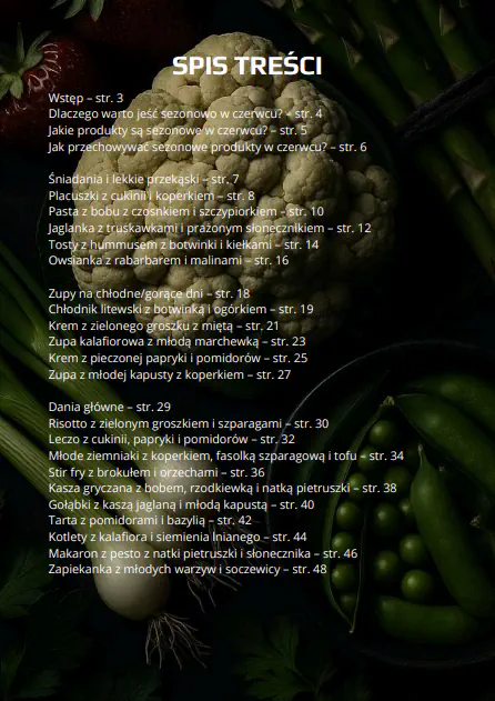 W środku znajdziesz 30 przepisów, które łączą sezonowe produkty z codzienną prostotą. Wszystkie dania bazują na składnikach łatwo dostępnych w czerwcu w Polsce: młodych ziemniakach, botwince, cukinii, młodej kapuście, kalafiorze, brokule, groszku, bobie, szczypiorze, koperku, truskawkach i rabarbarze. Bez udziwnień i bez listy zakupów „z połowy świata” – wystarczy kilka świeżych, sensownych składników, żeby ugotować lekkie zupy, konkretne obiady i proste desery idealne na czerwcowe dni.