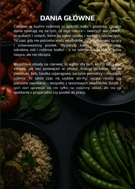 Najwięcej miejsca zajmują dania główne – dziesięć przepisów na domowe, roślinne obiady, które są konkretne, ale wyraźnie lżejsze niż zimą. Czekają na Ciebie m.in. dania z młodymi ziemniakami, warzywami z patelni, kaszami, strączkami i sezonowymi dodatkami, które dobrze sprawdzają się zarówno na obiad, jak i na kolację. To kuchnia roślinna bez kombinowania, oparta na świeżych produktach i prostych technikach, idealna na początek lata.