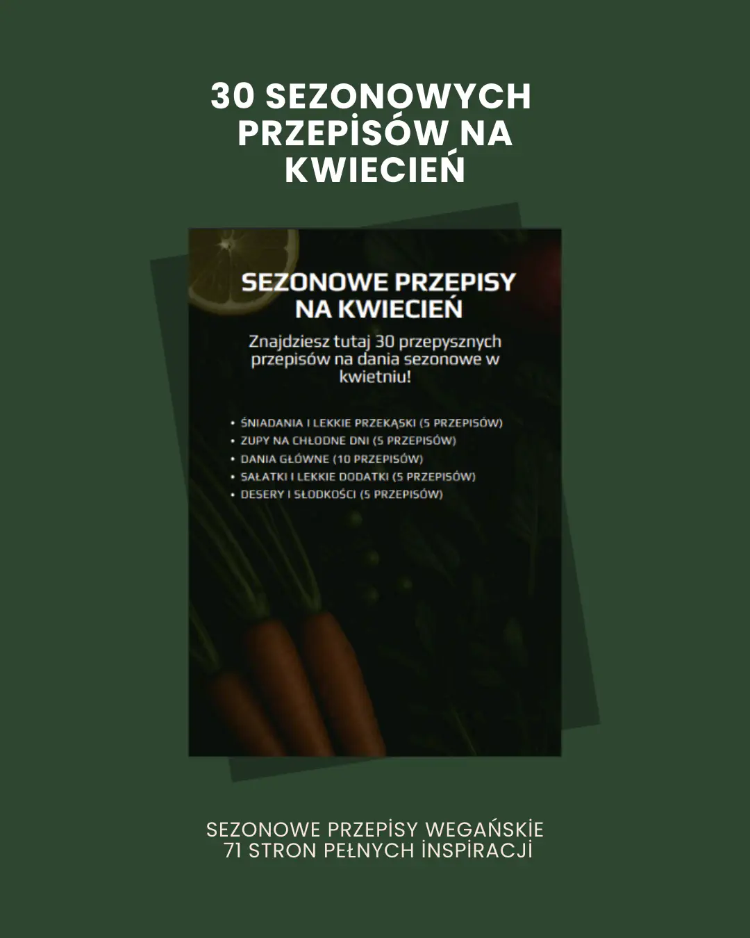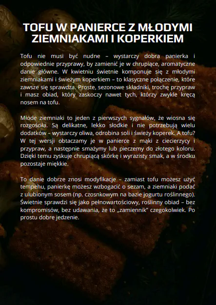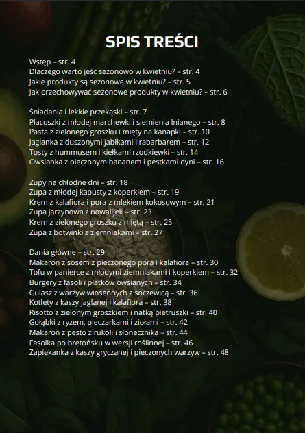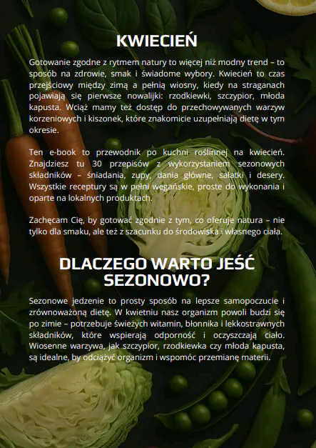 Każdy przepis jest wegański, prosty w przygotowaniu i oparty na lokalnych składnikach dostępnych w kwietniu, bez egzotycznych dodatków i bez zbędnego kombinowania. To e-book dla osób, które chcą gotować sezonowo, jeść konkretnie i roślinnie oraz mieć gotowe, sensowne pomysły na codzienne posiłki na start wiosny.