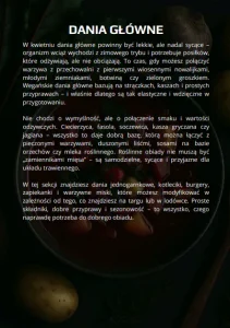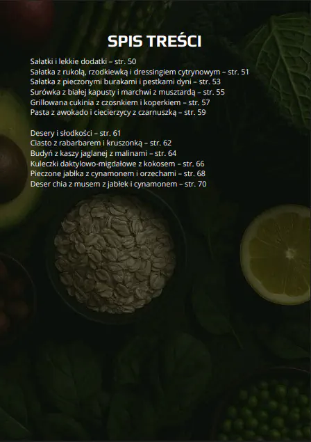 W środku znajdziesz pomysły na każdy posiłek dnia. Od pożywnych śniadań z kaszami, płatkami, owocami i świeżymi dodatkami, przez lekkie, ale nadal sycące zupy, aż po konkretne dania główne z kasz, strączków i pieczonych warzyw. Całość uzupełniają proste sałatki i dodatki z kiszonek i wiosennych warzyw oraz domowe desery oparte na owocach, kakao i naturalnej słodyczy.