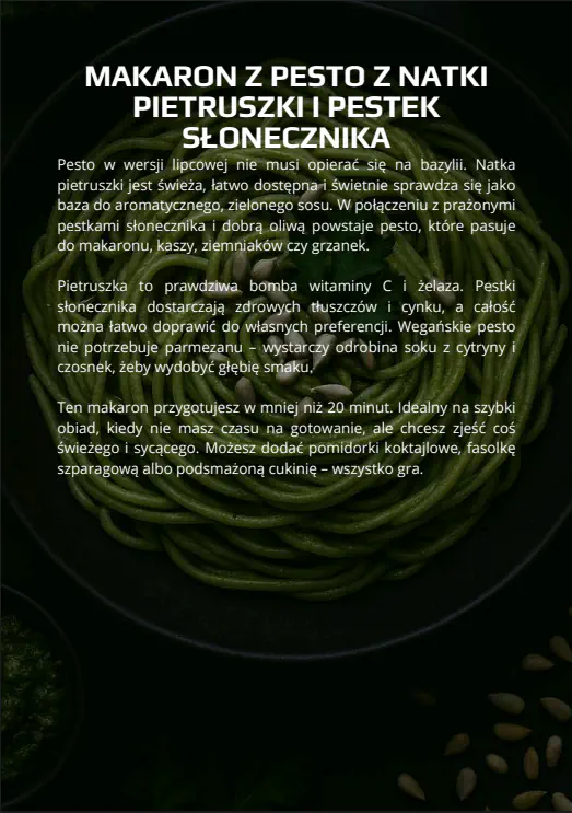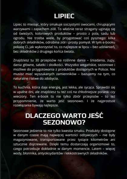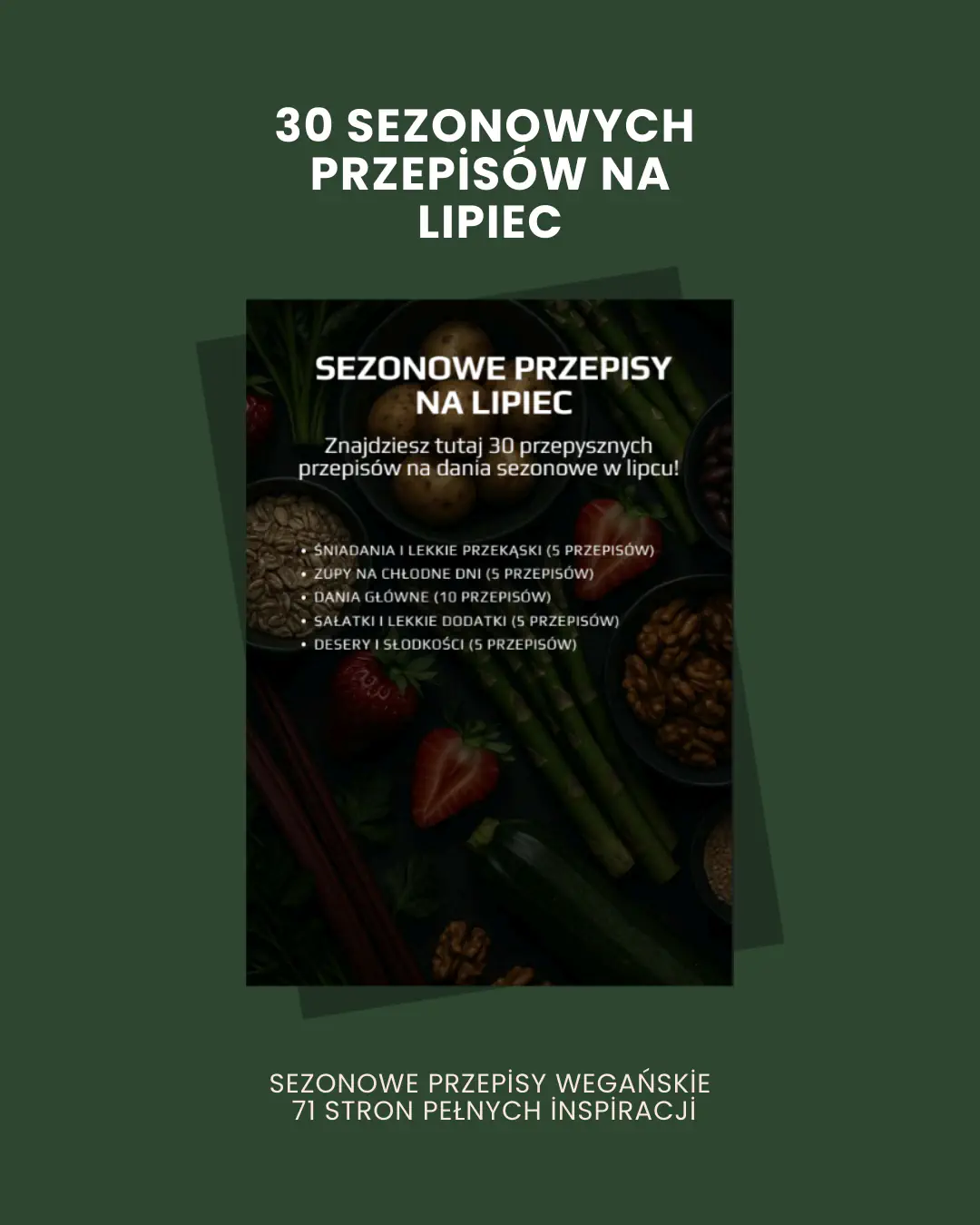 E-book „Sezonowe przepisy na lipiec” to około 70 stron inspiracji, które pomogą Ci gotować w zgodzie z sezonem i cieszyć się letnią kuchnią bez stresu. Znajdziesz tu 30 w pełni roślinnych przepisów. Od śniadań po desery – wszystko w duchu prostoty, świeżości i letniej sezonowości. Jeśli chcesz jeść sezonowo, lekko i roślinnie, a jednocześnie konkretnie i bez udziwnień, ten e-book będzie Twoim kuchennym wsparciem na cały lipiec.