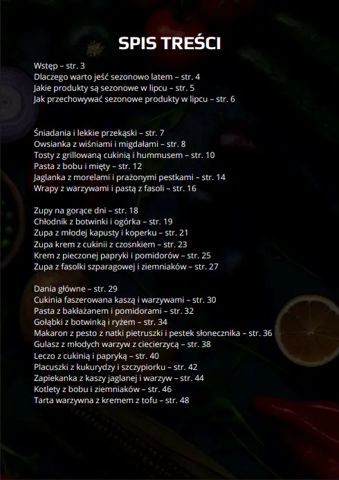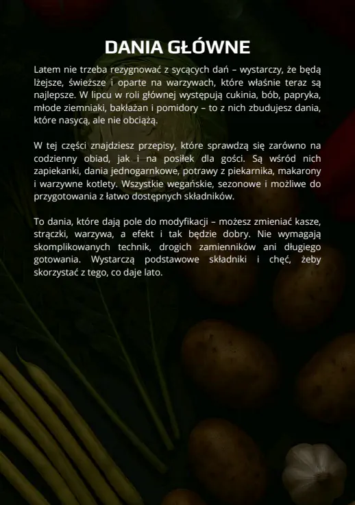Hasło „jedz sezonowo w lipcu” to nie moda, tylko bardzo wygodny sposób na ogarnięte, sensowne jedzenie w środku lata. Letnie warzywa i owoce są pełne smaku, nie potrzebują długiej obróbki i pozwalają gotować szybciej oraz lżej. Do tego strączki, kasze i tofu dają solidną bazę dla kuchni roślinnej: zapewniają sytość, stabilną energię i dobre proporcje makroskładników. Ten e-book pomoże Ci wykorzystać sezon w pełni i pokaże, że lipcowa kuchnia może być prosta, różnorodna i naprawdę przyjemna.